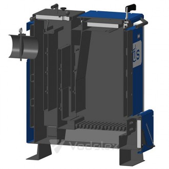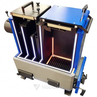 Diagrama schematică a arderii combustibilului în aceste cazane NEUS Mine arată astfel. Combustibilul lemnos este introdus în camera de încărcare pe grătare din fontă. De ce lemn? Cărbunele este, de asemenea, posibil, dar cărbunele în sine este un combustibil bogat în calorii în care aproape nu există substanțe volatile necesare pentru formarea procesului de piroliză, astfel încât cărbunele poate fi folosit ca aditivi porționați turnând combustibil lemnos pentru a crește durata procesului de ardere. . Când se utilizează lemn umed, la arderea cazanului, componenta de piroliză a lemnului de foc nu este eliberată, eficiența scade și toate avantajele cazanului de mină se pierd și obținem un cazan tradițional cu ardere de jos cu o eficiență de 60-65 %. Prin urmare, ca recomandare, mai întâi așezați lemn de foc uscat pe grătar și așezați lemnul umed pe straturile superioare.