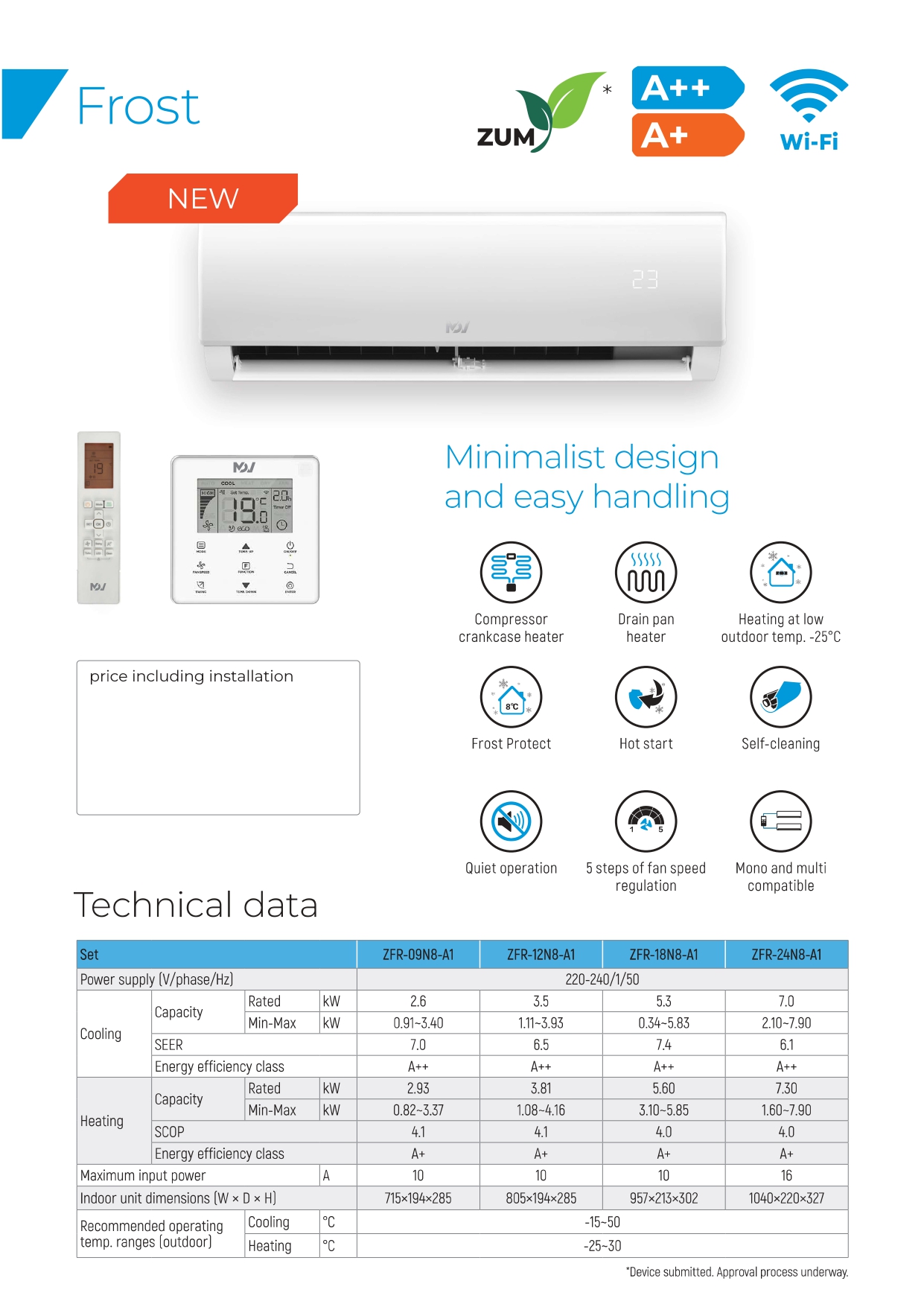Aparat de aer conditionat Ubbink Frost 9000 btu/h WIFI READY R32 Full DC Inverter, Clasa A++, -25 grade incalzire, Detectie Pierdere Freon, Filtru particole detasabil