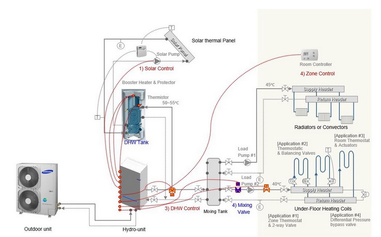 in aplicatii variate de incalzire (producere ACM – boiler special) / racire pt locuinte sau cladiri rezidentiale / de birouri etc., avand sisteme de incalzire cu temperatura joasa (incalzire in pardoseala si/sau ventiloconvectoare, chiar si radiatoare).