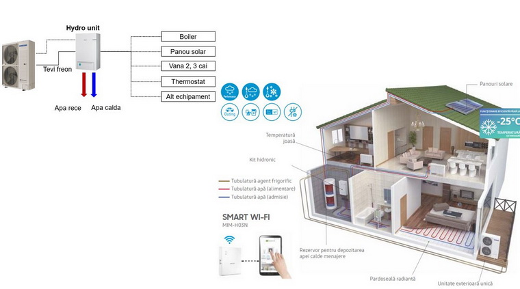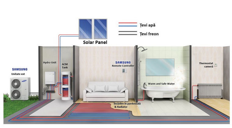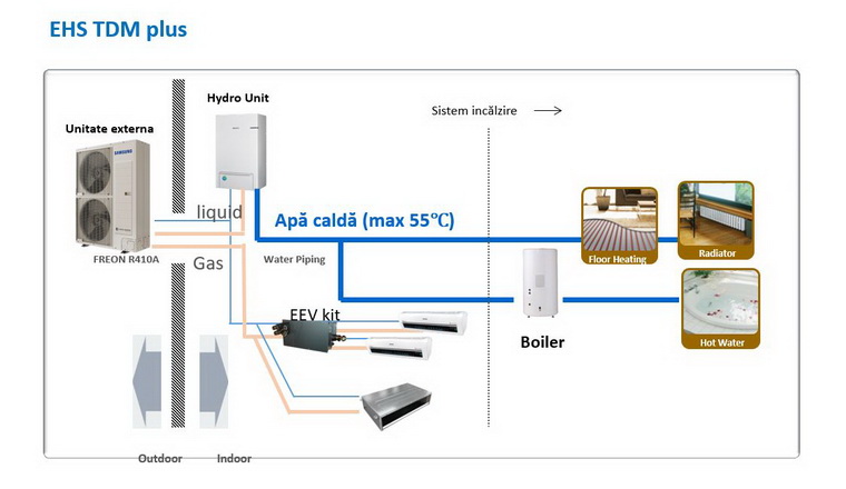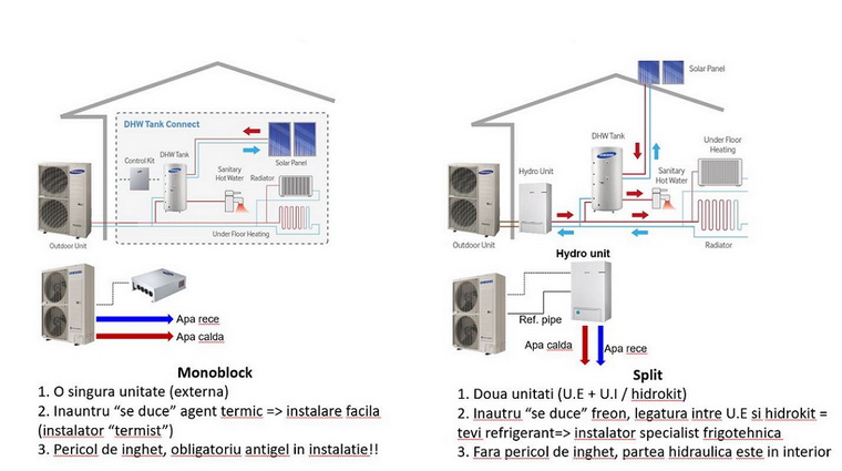 Inauntru “se duce” freon, legatura intre U.E si hidrokit = tevi refrigerant=> instalator specialist frigotehnica