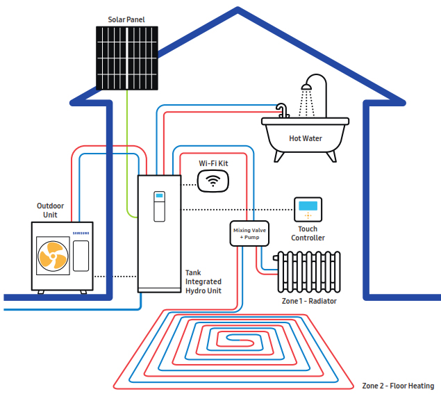 Datorita unitatii hidro cu rezervor integrat, ClimateHub Split functioneaza ca o solutie Samsung totala.